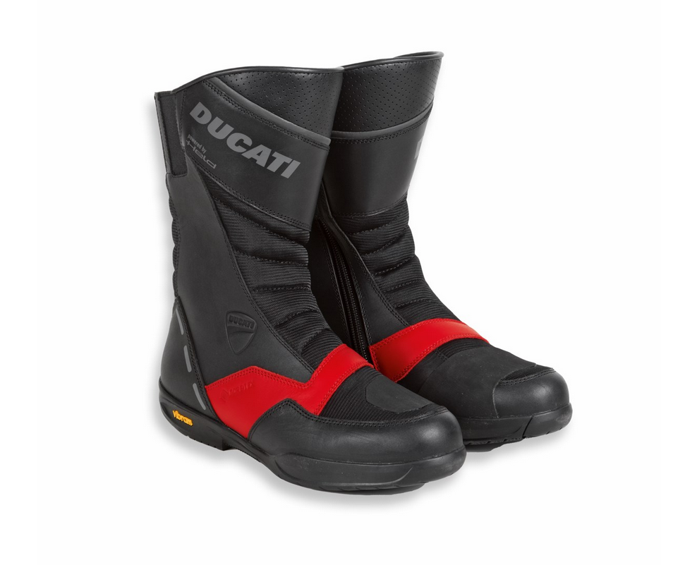 Gli stivali Strada C4, dal design minimalista e distintivo, sono stati sviluppati da Held in esclusiva per Ducati. Adatti a un utilizzo turistico, vantano soluzioni top di gamma, come la membrana in Gore-Tex® impermeabile e traspirante e la suola in gomma Vibram® antiscivolo, che li rendono perfetti anche per coprire a piedi distanze a medio raggio una volta scesi dalla moto. La tomaia è realizzata in pelle e tessuto tecnico, mentre la fodera in morbido poliestere conferisce alla calzata un fit estremamente confortevole. Sono dotati di punta e tallone rinforzati e di protezione della caviglia, per offrire il giusto livello di sicurezza durante la guida. Il rinforzo per il cambio marcia e la chiusura con cerniera laterale e banda in Velcro® li rendono particolarmente pratici e flessibili, mentre gli inserti in reflex conferiscono maggiore visibilità. Un accessorio dedicato ai motociclisti che cercano ottime prestazioni, unite a uno stile inconfondibilmente Ducati.